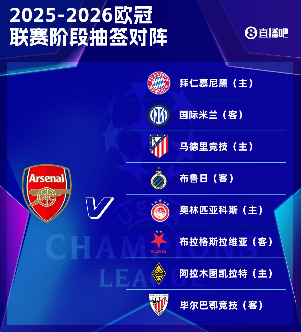 8月30日,欧足联正式发布了欧冠联赛阶段的赛程安排,阿森纳的完整对阵时间如下(均为北京时间):